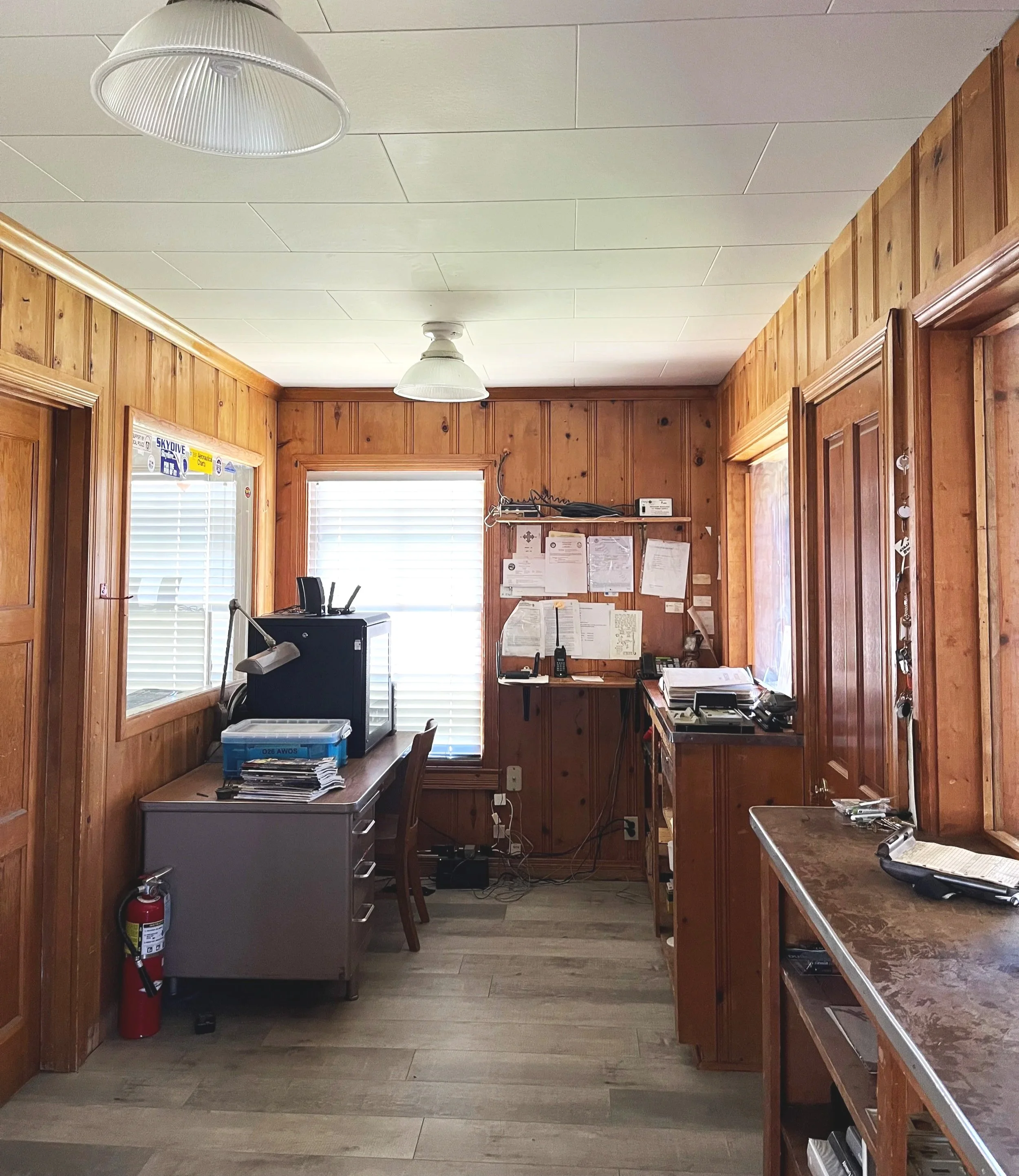 How about the details, you may ask? Well, for the record, the Pilots Lounge has a new tongue and groove ceiling, refinished floors, glass in the window partitions to the County office, a painted back wall where once there was fake paneling covering the original wall, vintage lighting, and a bookshelf where once there was a boarded up doorway. A beautiful new double paned picture window frames the Inyos for pilots who come in to seek shelter from the weather. The front office is repaired and painted, with a final window installation donated by the amazing crew at Banks Glass, and provides a desk for pilots to work utilizing the free public wifi. The first display of pictures highlighting history of the Tunnel Aircamp are hung, a gift from Janeen Langenheim, who ran the FBO with her husband for many years after Bob and Shirley White. More historical displays will be added. The bathroom has a refinished wood floor, repainted walls, a new toilet, new fixtures, and a new insulated window, thanks again to Banks Glass. The kitchen also has a new tongue and groove ceiling, painted walls, new double paned glass in the windows (guess who?) and a new floor which extends into the County office. The County office ceiling was also repaired and painted. There are new blinds in all the windows.